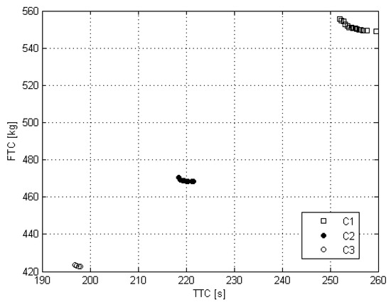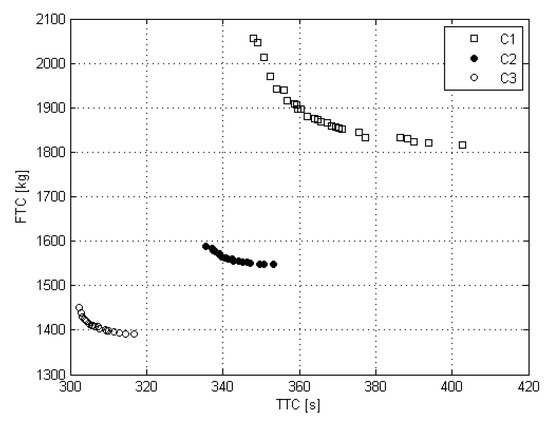 A comparison of the maximum power Specific Excess Power and Energy Efficiency contours of the three examined configurations unveils the different performance characteristics of the engines examined: The EJ200 is a low-bypass turbofan engine with a higher static thrust than the J79 turbojet. This accounts for an acceleration and efficiency advantage of the former over most of the aircraft’s envelope, particularly at high altitude and low-to-medium Mach numbers. On the contrary, because of its turbojet cycle, the J79 has better performance at medium altitudes in the transonic Mach number range, gradually expanding to the entire altitude range as the Mach number further increases. In Case B, this results in smaller differences in TTC between configuration C1 and configurations C2 and C3 compared to the results of Case A (Figure 12 and Figure 16). The different performance characteristics of the two engines also become evident by comparing the minimum-time supersonic climb trajectories of configurations C2 and C3 with that of configuration C1. The J79-equipped configuration (C1) favors an acceleration at medium altitude in the transonic regime, followed by a zoom climb to reach the specified altitude (Figure 17), whereas the EJ200-equipped configurations (C2 and C3) use a subsonic climb to high altitude followed by an accelerated supersonic climb to the desired conditions (Figure 18 and Figure 19). On the contrary, minimum-fuel supersonic climb trajectories are similar for both engines, which lead to a rather “broad” front of optimal solutions for configuration C1 (Figure 16) compared to the respective results for configurations C2 and C3. The same, to a smaller degree, also apply to the results of the subsonic climb case, as may be observed in Figure 12, Figure 13, Figure 14 and Figure 15: The greater “distance” between minimum-fuel and minimum-time trajectories for configuration C1 leads to greater variations in FTC and TTC among members of the resulting front. Consequently, this constitutes an additional advantage of the EJ200-equipped configurations since the relative coincidence between minimum-time and minimum-fuel climb paths minimizes the compromises required (in fuel when climbing for the minimum time and the reverse) in each climb case. As a general conclusion, the characteristics of the low-bypass turbofan cycle appear to be better suited to typical aircraft mission requirements, leading to faster climbs with less fuel consumption. On the other hand, the regions where the performance of the turbojet is dominant are of little operational interest, a fact that is justified by the evolution of military aircraft engines since the development of the J79 in the late 1950s.