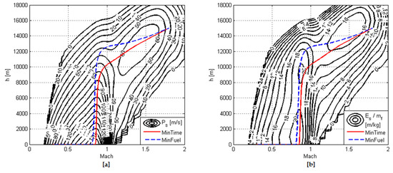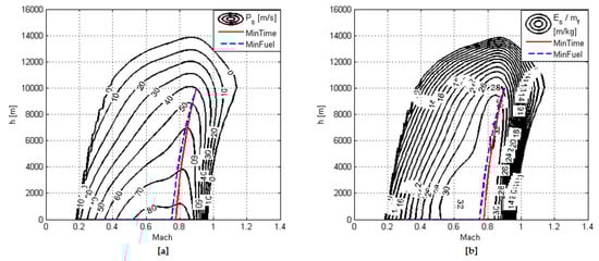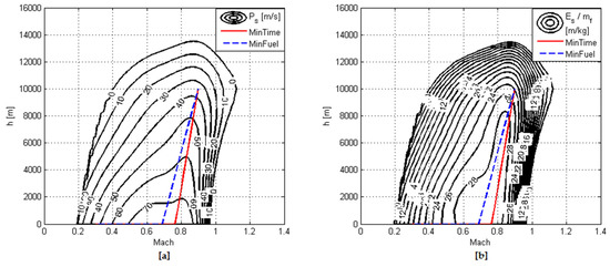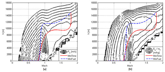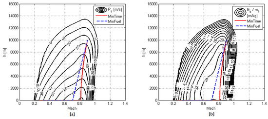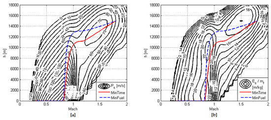 Case B, Configuration C1; Minimum Time and Minimum Fuel climb paths, plotted over contours of: Specific Excess Power (m/s) (a); and Energy Efficiency (m/kg) (b).