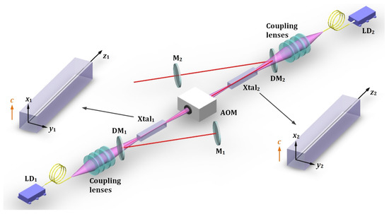 Experimental setup of the dual-rod acousto-optic Q-switched laser systems with the corresponding coordinate frames: LD, laser diode; Xtal, crystal; AOM, acoustic optical modulator; M, mirror; DM, dichroic mirror.