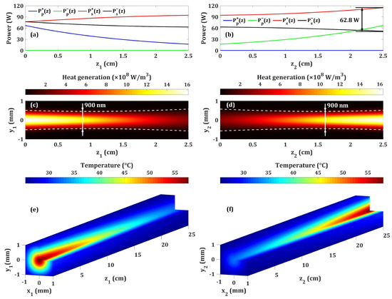 Power distributions along the z-axis in (a) Xtal 1; (b) Xtal 2, heat generation distributions of (c) Xtal 1 at face = 0; (d) Xtal 2 at face = 0 and temperature distributions within (e) Xtal; and (f) Xtal 2 for the continuous-wave condition.
