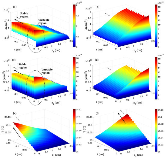 In our simulation model, the coupled dynamic equations without any certain periodic function hypotheses are directly solved, calculating thermal power via nonradiative transition rates and energy gaps. Thus, the first few unstable 4D heat generation pluses within two crystals can be solved, as shown in Figure 4c,d, corresponding to the physical reality. To the best of our knowledge, almost all of previous 4D thermal analysis models [19,20,21] roughly expressed the thermal load as certain periodic functions using some classical formulas, thus they cannot work out the unstable region, i.e., the first few unstable heat generation periods . The comparison shows an improved accuracy of our new model for simulating 4D heat generation in Q-switched laser crystals. Just like the laser pulse sequence, the heat generation pulses in unstable regions are a mixed train of high-intensity and low-intensity pulses. Figure 4c,d show the temporal evolution of temperature growth in two crystals. After 1.5 ms, the increment of maximum temperature in each crystal is about 0.12 C, while the temperature distributions do not reach the steady state.