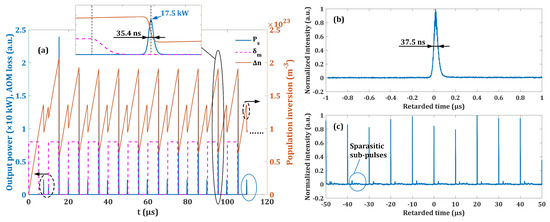 The parasitic sub-pulses, as shown in Figure 5, are usual phenomenon in active Q-switched lasers, the detailed explanation of which can be Referred to Ref. [33]. This unwanted phenomenon can be eliminated by adjusting duty cycle, but the parasitic pulses here are so weak that cannot impact on output properties. Additionally, the existing parasitic pulses can reflect the accuracy of our numerical model. Thus, we did not address it in this work. The experimental pulse duration is 37.5 ns, which is in accordance with the simulation result that 35.4 ns in a tolerable error.