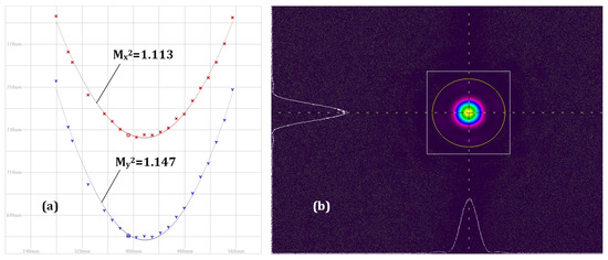 (a) experimental output laser beam quality; (b) spatial mode profile measuring via a laser beam analyzer in the stable Q-switched condition.
