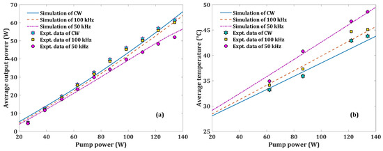 Figure 8a shows the simulation results and corresponding experimental data of average output power versus pump powers. Figure 8b shows the simulation results and corresponding measured data of average temperature on the left end face of Xtal 1 versus pump powers. We have considered the compensation of the measurement resolution of the thermal imager in the average method. These comparisons between experimental and numerical results verify the accuracy of our model in both simulating power and thermal effect domain.