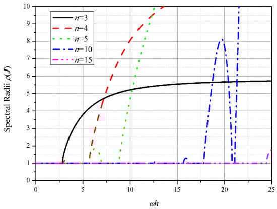 where S = G−1, then stable interval can be obtained by using criterion ρ(J) ≤ 1, ρ(J) is the spectral radius, which is shown in Figure 1, and the first stable intervals are listed in Table 2. It should be stressed that, for different sampling point n, ρ(J) > 1 or ρ(J) = 1.