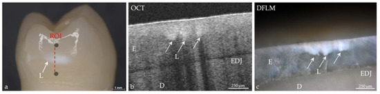 Conformance of visual assessment with optical coherence tomography. (a) Extracted human premolar with a carious lesion (L) of International Caries Detection and Assessment System (ICDAS II) Code 1. The lesion is visually detectable only after drying. Marks define the region of interest (ROI); (b) In the cross-sectional image of the ROI, generated using spectral domain OCT, bright shadowed spots reveal the lesion area is limited to the first half of the enamel (E); (c) After sectioning, demineralization can be imaged using dark-field light microscopy (DFLM) corresponding to the lesion details in the OCT image. D: dentin, EDJ: enamel-dentin junction.