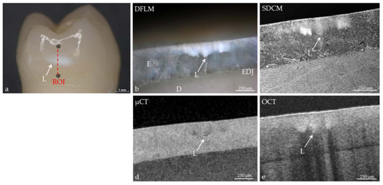 Extracted human premolar with a carious lesion (L) of ICDAS II Code 1. (a) ROI; (b) The demineralization within the ROI (white arrow) is equally imaged by dark-field light microscopy (DFLM); (c) spinning-disc confocal microscopy (SDCM); (d) X-ray microtomography (µCT); as well as (e) SD-OCT. E: enamel, D: dentin, EDJ: enamel-dentin-junction.