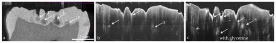 Image contrast and the spatial separation of the lesion body versus sound enamel can be further enhanced using polarization-sensitive OCT [45]. Additionally, variation of the imaging beam angle by using different positions of the OCT probe can improve the detectability of non-cavitated occlusal carious lesions (Figure 8). The sensitivity of the method can be increased among others by increasing the integration time (A-scan rate) or using coupling media [46] to minimize surface reflections, which can also contribute to enhance the image contrast (Figure 9).