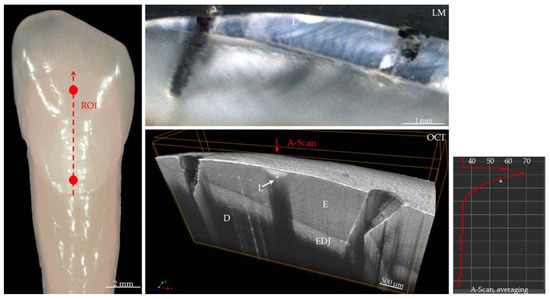 Extracted human canine. There is no conformance of visual assessment with OCT. Visual inspection of the dry smooth surface does not reveal signs of an early-stage carious lesion (L). In contrast, the 3D SD-OCT cross-sectional image of the ROI showed a distinct bright area (L) within the first quarter of enamel (E) with a shadow underneath. The lesion can be confirmed using light microscopy (LM). The A-scan of the position marked in the OCT-image shows the depth profile of the demineralized zone in the enamel surface (A-Scan average 5, additional signal median averaging 6). * grey scale between demineralized and healthy region.