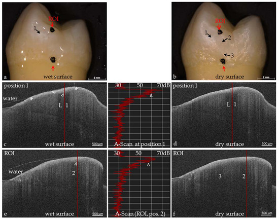 Extracted human premolar with early proximal demineralizations. There is a partial match of the visual and OCT assessment. (a) Hardly visible on wet enamel, the early demineralization (1) could also be seen on the dry surface (b); (c–f) SD-OCT reveals a clinically invisible demineralization in the outer enamel zone (*); (c,d) The OCT images reveal a bright signal in position 1 (L, shadow); (e) The OCT of the wet surface shows an early demineralization in position 2 of image (b); (f) After air drying, an additional signal arises in position 3. Visually both lesions are invisible (a,b). With the knowledge of the OCT images, at points 2 and 3, slight opacities could also be anticipated on the images (a,b). The A-scans (average 5) of the marked positions 1 and 2 in the OCT-images demonstrate the depth profiles of the demineralized zones of the enamel surface. Δ grey scales between demineralized and healthy region.