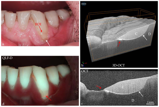 Canine tooth in vivo. (a) A cervical composite restoration (C) shows a margin discoloration (white arrow); (b,c) In the 3D and 2D OCT images, a margin gap with ingress of material is detected (red arrows). At dentin (D), an extensive interfacial gap has formed (white arrows); (d) Using quantitative light-induced fluorescence the image showed red fluorescence (red arrow) at the cervical restoration margin indicating bacterial activity by porphyrin invasion into the gap. There are no signs of “secondary caries” at the restoration margin, but the stability of the situation requires observation over time (monitoring).