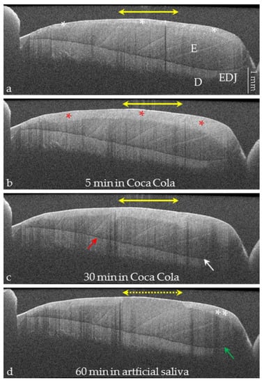 Extracted human incisor. (a) Starting situation. The SD-OCT shows a small bright band in the enamel surface (E), which could represent a lower mineralized zone (white asterisks). The yellow double-headed arrow indicates the surface area, which was covered by composite to prevent demineralization of the enamel; (b) After 5 min exposure of enamel to Coca Cola (37 °C) a broader bright area (red asterisks) can already clearly be distinguished, which represents a zone of erosion that also extended below the composite coating; (c) After 30 min of exposure, the demineralization has made further progress, which is indicated by the reduced contrast at the enamel-dentin junction (EDJ, red arrow) or its disappearance (white arrow); (d) After removal of the composite coating the tooth was stored in artificial saliva. Within 60 min, the bright demineralized area previously covered by composite (dotted double-headed arrow) completely disappeared indicating a process of repair (“remineralization”). In uncovered areas, the EDJ appears in a higher contrast compared to (c) and is more extended (green arrow). Particularly in the incisal area, the erosion is clearly reduced (**) compared to (b,c).