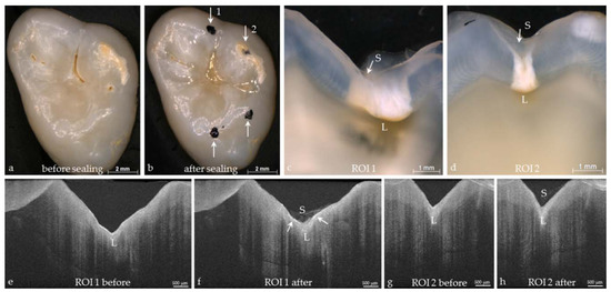 (a) Extracted human molar before; and (b) after fissure sealing with Helioseal. (c,d) In cross-sections through ROI 1 and 2 occlusal caries beneath the sealer can be identified (L). Using SD-OCT, carious lesions (L, shadow) can be localized (e,g) before; and (f,h) after sealing. The sealer (S) has penetrated into the fissures, is inhomogeneously distributed and adapted to the enamel surface with (f, white arrows) or (h) without interfacial gap; (f) The bright signals reveal an interfacial gap (white arrows) between sealant and enamel. Monitoring will reveal changes over time.