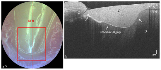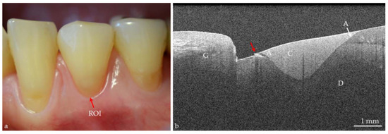 OCT quality control in vivo. (a) A cervical composite (C) restoration at a premolar 34 immediately after filling the cavity. The gingiva (G) is slightly retracted. In contrast to Figure 18 the composite has been homogeneously dispersed; (a) Using visual-tactile assessment the restoration margins appear smooth; (b) However, in the OCT image at dentin (D, ROI) a margin gap in combination with a composite overhang indicates a critical area (bright line, red arrow). In knowledge of the OCT image, the overhang could easily be removed. An adhesive layer (A) could only be partially detected.
