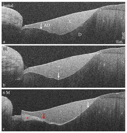 As OCT is non-invasive, it inevitably follows that it offers the possibility of monitoring the bond failure at the same composite restorations in the same cross-sectional images at any time. In long-term clinical studies conducted by the authors, composite restorations will be imaged parallel to clinical assessment using SD-OCT (vestibular areas, Class V, Figure 4c). In a B-scan by measurement the lengths of adhesive failure and interface the proportion (%) of the interfacial adhesive failure can be calculated separately for enamel, dentin or cement. In 25 equidistantly distributed B-scans of an image stack the mean values of a restoration result with regard to enamel, dentin or cement. From these the values per group can be calculated over the entire period of study. The results of the clinical studies will reveal whether OCT can be an early, cost-effective, and time-saving tool for evaluating the performance of adhesives or composite restoration systems in vivo. In vitro and ex vivo, an exceptional methodological advantage is that identical cross-sectional images will be assessed and compared before and after artificial aging. This results in pairs of measured values. In this case the variance between specimens can be excluded and just the variance within the specimens remains. Compared with unpaired values, at identical ratings of statistical power the number of specimens can be reduced.