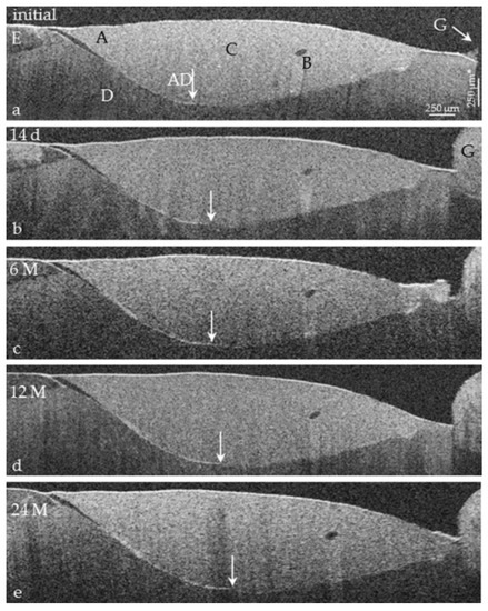 Monitoring of tooth-composite bond using SD-OCT in vivo. (a) A cervical composite restoration (C) immediately after filling the cavity in small composite increments. The gingiva (G) is slightly retracted. The composite has been homogeneously dispersed. Initially the bright line marks an extensive adhesive defect (AD) at enamel (E) and dentin (D); (b–e) The same cross-section (see bubble in composite, B), imaged using OCT in the period 14 days (b) to 24 months (M, e); the interfacial gap has progressed slightly (bright line, white arrow). There are no signs of secondary caries. A distinct adhesive layer (A) could only be partially detected. * Vertical bar is related to refractive index n = 1.5.