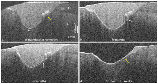 In vivo monitoring of the tooth-composite bond using SD-OCT. (a) A cervical composite restoration (C) at premolar 34, sixteen months after restoration. The cavity was filled in increments. The composite contains imperfections (yellow arrow). The bright line marks an extensive adhesive defect (white arrows) at dentin (D). (b,c) The same cross-section imaged using OCT in the period up until 50 months; the interfacial gap has progressed (bright line, white arrows), but there are no signs of secondary caries. (d) Three weeks later, the restoration failed. The imperfection has probably acted as a hinge (yellow arrow). At enamel (E) this saved the composite from loss. * Vertical bar is related to refractive index n = 1.5.