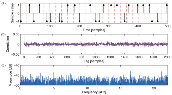 When the sample rate of 44,100 Hz is used, the choice of = 2205 pulses/s, according to Equation (2), leads to a convenient integer value of samples for the average pulse distance. Figure 1a shows the first 500 samples of an example velvet-noise sequence with these parameters. There is only one non-zero sample seen between any two grid boundaries. The autocorrelation function of the velvet-noise sequence shown in Figure 1b is close to a unit impulse, as its maximum occurring at is 1.0 and at other lags the correlation is smaller than about 0.01. The power spectrum of the velvet-noise sequence shown in Figure 1c is fairly flat.