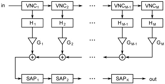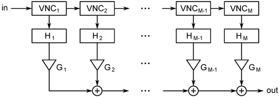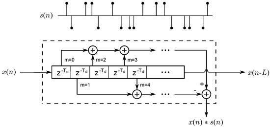 where is the input signal, * denotes the convolution, and and contain the indices of the positive and negative impulses, respectively, in the velvet-noise sequence . This multi-tap delay-line implementation of VNC is illustrated in Figure 2.