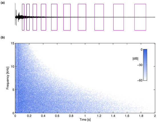 Uniform segmentation of an RIR should not be used, as the constant frame rate causes a periodic disturbance in the synthetic response. This is reminiscent of the flutter echo effect, which is a common problem in room acoustics. Much effort has been made to reduce this effect in recursive reverberation algorithms that use a pseudo-random noise sequence [13,14]. Thus, it makes sense to use a non-uniform segmentation scheme in the FVN algorithm, as suggested in [16]. Another motivation to use a non-uniform framing is that the filter for each segment would be sufficiently different. In a typical RIR in which the exponential decay is faster at high frequencies than at low, a constant decrease in bandwidth, such as a 1-kHz narrowing, takes place non-uniformly in time—quickly in the beginning and slower towards the end of the RIR. This also motivates the use of longer segments at the end than at the beginning of the RIR. Figure 4a shows an example of a RIR and its segmentation. The impulse response has been measured in the concert hall in Pori, Finland (this impulse response of the concert hall is available online at http://legacy.spa.aalto.fi/projects/poririrs/).