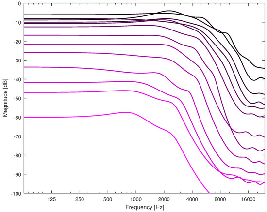 Magnitude responses of coloration filters of order 10 for every second segment of the impulse response of the Pori concert hall. The same color codes as in Figure 4a are used such that the darker lines correspond to the beginning of the RIR and the color gets lighter towards the end of the RIR.