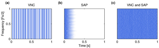 Velvet noise is a special kind of random noise, which was discovered by Karjalainen and Järveläinen [13]. It consists of sample values , 0, and 1 only. The most surprising attribute of velvet noise is that even when of its samples are zero, it sounds smoother than Gaussian random noise, which is generally thought to be the prototype of white noise [13,23]. Velvet noise is of interest in this work, because it provides a computationally efficient way to convolve an arbitrary signal with white noise [16].