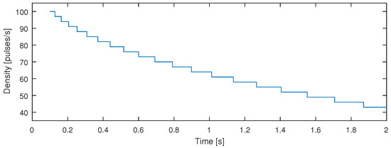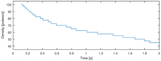 By experimenting with different pulse densities and listening to the outcome, it was decided that = 100 pulses/s is sufficient in the very beginning of the late reverberation, where segments are very short, whereas = 40 pulses/s can be enough at the end where the bandwidth gets narrow. Between these extremes, the density is decreased linearly as a function of the segment index m. The selected pulse density for each segment is shown in Figure 8.