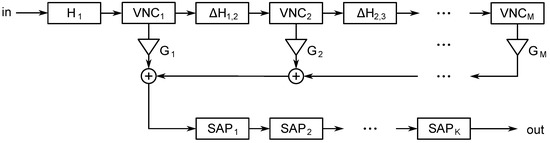 Since the cutoff frequency of the filters in each segment usually decreases towards the end of the RIR, it is possible to exploit the previous filters in the subsequent filtering stages. The basic idea is to design the first lowpass coloration filter but to construct the other filters by cascading differential filters , for . This structure is illustrated at the top of Figure 9.
