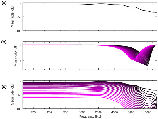 where , for is the attenuation at the center frequency and is the bandwidth of the notch (Hz) [25]. The differential filters can be designed to match the difference between the neighboring coloration filters. Figure 10b shows responses of the notch filters designed from the family of 10th-order coloration filters. Figure 10c shows the total effect of cascading 1 to of these filters with the first filter . The overall shapes and cutoff points are very similar to the responses shown in Figure 5.