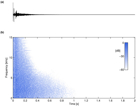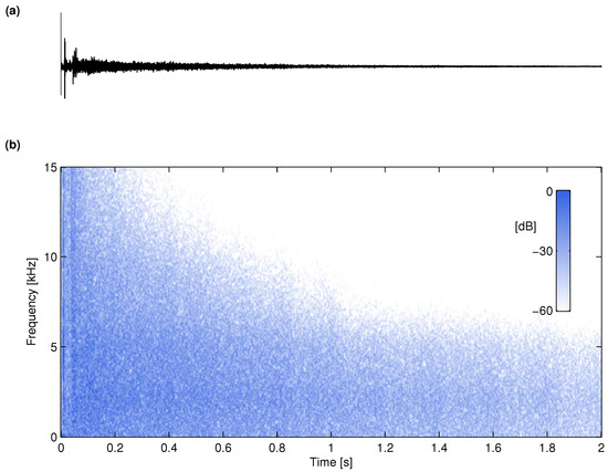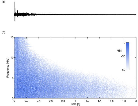 (a) Synthetic RIR produced using the advanced FVN method and (b) its spectrogram. Cf. Figure 4.