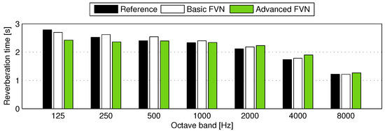 The synthetic RIR produced using the advanced FVN model and its spectrogram are shown in Figure 12. As an objective comparison, Figure 13 shows the reverberation time against octave bands for three RIRs (original, basic FVN, and advanced FVN). We decided to use instead of , because the signal-to-noise ratio near the end of the RIR does not sufficiently measure 60-dB decay; is the measured time of a 30-dB decay multiplied by two.