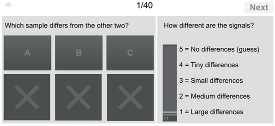 The test type was ABX [27], which refers to a pair-wise test in which the subject always compares three sound files, A, B, and X, and is asked to identify whether sound X is the same as A or B. Additionally, in our test, the subjects had to evaluate the perceived difference between A and B on a five-point scale, a variant of the mean-opinion score. Figure 16 shows the user interface used in the listening test. The 18 test sounds were played in pseudo-random order, and they all appeared twice during the test, leading to 36 cases to be evaluated. Additionally, four extra cases were played in the beginning of the test, the answers of which were deleted from the data, since learning was assumed to occur during the first few cases, and only after this are the persons able to carefully and objectively evaluate the sounds. Thus, the total number of cases presented to the subjects in the listening test was 40.