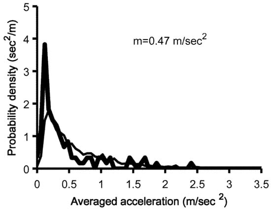 Probability distribution of the averaged acceleration per 10 min, obtained from continuous 24 h recording. Thin lines: distribution curve of 15 healthy volunteers, thick line: distribution curve of a representative 72-year-old man with Parkinson’s disease.