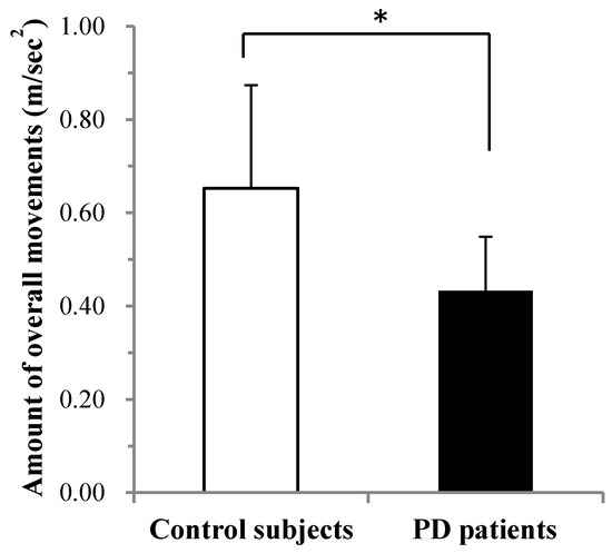 Amount of overall movement over 24 h measured by the portable MIMAMORI-Gait device in patients with Parkinson’s disease (PD) and healthy control subjects. Data are mean ± SD. * p < 0.01.