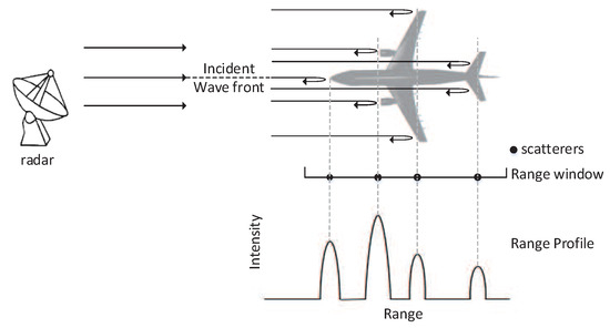 In this paper, the scatterer model of the wideband LFM signal is used. It is assumed that the target is in the far field and the incident wave is a plane wave. The scatterers are located on the line of sight. The range profile of target in wideband radar is illustrated in Figure 1. In stretching processing, the wideband echo signal reflected by the scatterers is mixed with the local wideband LFM signal. For single scatterer, the mixing result is a single frequency signal, whose frequency is determined by the round trip time of the scatterer. For multiple scatterers, the mixing result is composed of multiple signals with different frequencies. Therefore, the wideband echo signal is converted to a narrowband signal, of which the bandwidth is determined by the length of the target. After performing FFT operation, this stretched narrowband signal can be transformed to a range profile along the radar line of sight (RLOS), as shown in the bottom of Figure 1. The parameters that will be frequently used in later derivation are listed in Table 1.