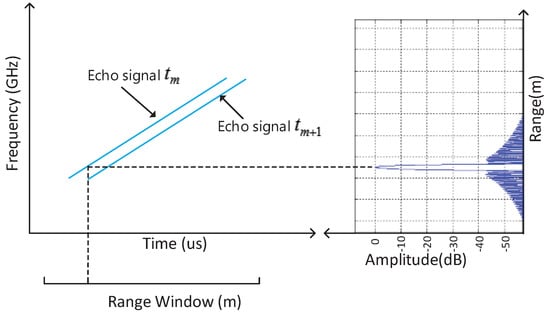 The idea of the proposed method is shown in Figure 2, where the UR signal is utilized for the convenience of illustration. It is already known that the stretching operation can transform a wideband echo signal into a narrow-band signal. In the CCAE method, considering one of the two adjacent echo signals (e.g., the echo at slow time ) as the “local reference” signal, the other one (e.g., the echo at slow time ) is “stretched” into a single tone signal. The frequency of the “stretched” signal contains the information of the distance differences between the slow time and . The motion parameters can be estimated according to the distance differences. In the next subsection, the CCAE method is derived mathematically to prove the idea.
