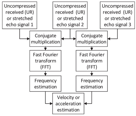 - The first UR or stretched signal is multiplied with the conjugate of the second UR or stretched signal. For acceleration estimation, the second echo signal is also multiplied with the third echo signal.