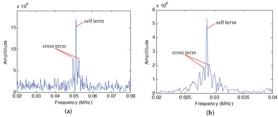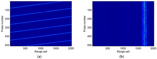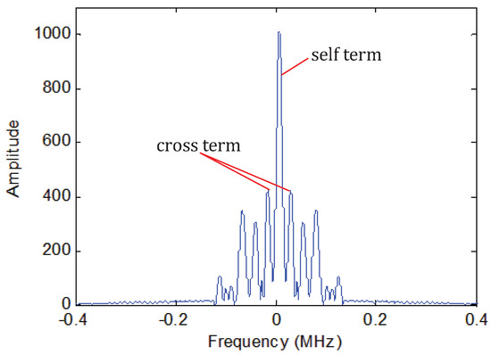 Let it be assumed that the peak position of is . When , Equation (16) is the same as the sinc function in Equation (14). Since all scatterers are assumed to locate along the line of sight, the distance difference between and is the same for every scatterer of the target. Namely, and for . The energy of all scatterers will accumulate on one peak, which can be regarded as the main peak of the spectrum. When , because of the differences in the combinations of p and q, the distance difference will bring a number of frequency components into the spectrum. The amplitudes of these spectral lines are much less than that of the main spectral line . As seen from Equations (12) and (14), the main peak position of the spectrum is determined by the distance difference of the target between slow time and . Therefore, the target parameters can be obtained by estimating the frequency of the main peak position. This can be implemented by using the frequency estimation methods, such as FFT and Newton’s method [30]. The estimated frequency can be expressed as:
