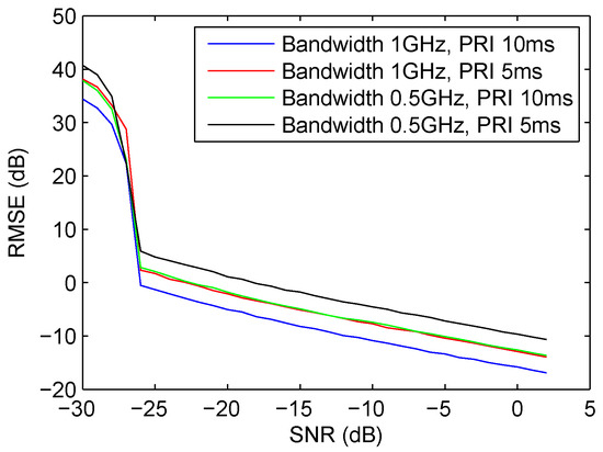 Next, we compare the performances of the proposed CCAE method with different bandwidths and PRIs, under different SNR conditions. The SNR varies from −30 dB to 2 dB. Under each SNR, 1000 Monte Carlo simulations have been carried out. Figure 5 shows the RMSE results. It is observed that when the bandwidth or the PRI increases, the RMSE decreases. To achieve the same RMSE, the test case with GHz and ms requires the lowest SNR, and hence, it has the best performance. Under the same SNR, the RMSE performance of the case with GHz, ms is about 3 dB lower than the case with GHz, ms and the case with GHz and ms. The performance difference is about 6 dB between the case with GHz, ms and the case with GHz, ms.