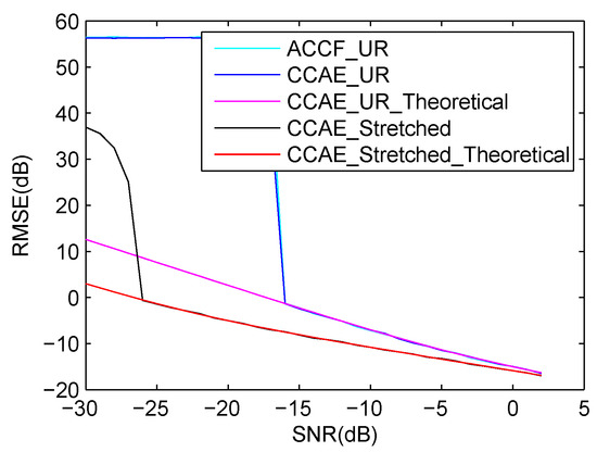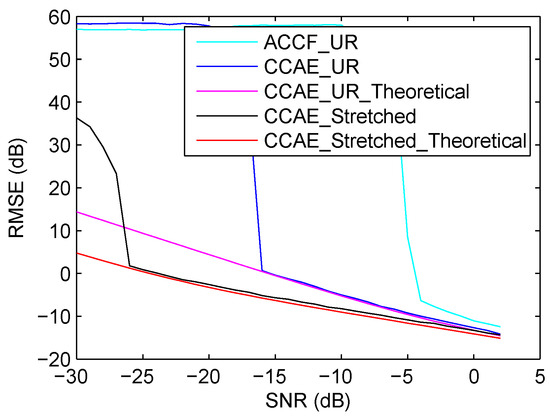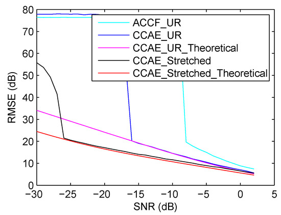 The energy loss is not considered in the above derived RMSEs. In Section 3.2, it is pointed out that the non-overlapping part of the conjugate multiplication result induces the loss of signal energy. The loss can be figured out to be small, which has little influence on the estimation performance. According to Equation (25), conjugate multiplication causes a decrease in SNR, consequent to which the performance of the proposed method also suffers. However, since the noise bandwidth of the stretched signal is reduced to be much smaller than that of the UR signal, the SNR of the stretched signal is higher than that of the UR signal. Therefore, better estimation performance can be achieved by applying the CCAE method to the stretched signals.