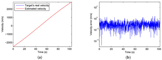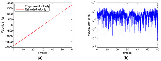 Estimation results of Dataset 1. (a) The estimated velocity and the target’s real velocity (due to the high speed of the target and the high precision of the estimated velocity, the two lines overlap). (b) The absolute values of differences between the estimated velocities and the target’s real velocities.