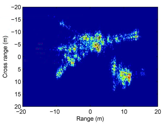 Finally, the proposed CCAE method is applied to range alignment in the ISAR imaging procedure, with a civil aircraft as the target. Figure 12a shows the target’s range profiles of wideband radar at different slow times (i.e., pulse number). Due to the target’s motion, the range profile of the target moves across the range cells, which is called the range migration (RM). Thus, the range profiles at difference slow times are not aligned. As a result, the energy of the different range profiles cannot be focused to generate a high quality image. Therefore, the motion compensation is necessary for ISAR imaging. In this experiment, motion compensation is performed using the proposed CCAE method. After motion compensation, the range profiles of different slow times are aligned, as shown in Figure 12b. With motion compensation, the RM effect is eliminated, resulting in a focused ISAR image (Figure 13). These results with real data demonstrate that the proposed method is effective in practical radar systems.