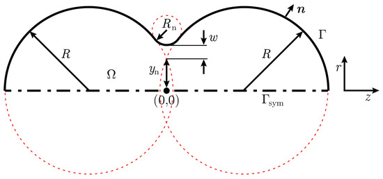 We consider two evenly-sized liquid polymer particles that are initially connected to each other by a neck. The initial geometry is given in Figure 1. The outer surface of the geometry is , with the outwardly-directed unit normal vector. The geometry is assumed to be axisymmetric, where the axial coordinate is denoted by z and the radial coordinate by r, using the convention . The symmetry axis is given by . The radii of the particles R, together with the initial contact radius , define the initial geometry. To avoid discontinuities in the slope of the interface, the parameter [20] rounds off the neck region. Due to the round off by , the real initial contact radius becomes . These two liquid particles will merge into one larger sphere with radius , determined by the initial volume of the geometry, under the influence of the surface tension prescribed on surface .