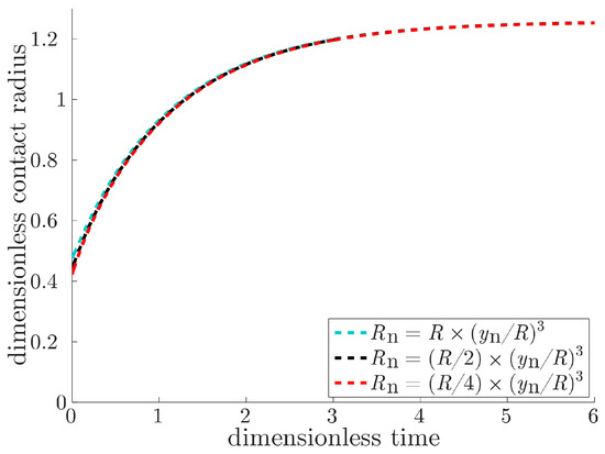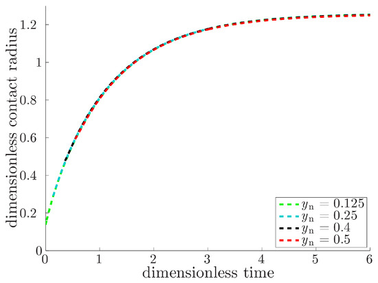 Next, we keep the initial contact radius constant , and we change the round off parameter . The results are given in Figure 7, where the contact radius y is depicted in time t. Since all curves coincide, we can conclude that the influence of the round off parameter on the shape evolution of the contact radius y is negligible.