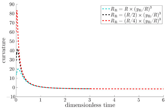 Furthermore, the curvature at point at the surface of the neck is shown in time t for different round off parameters in Figure 8. Following Dantzig and Tucker [37], the curvature is calculated from the contour curve of surface , using:
