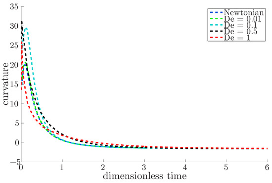 In Figure 11, the curvature at point at the surface of the neck is shown in time t for different Deborah numbers , using the Giesekus model with . As is shown for the Newtonian constitutive behavior, the curvature at point increases with respect to the initial geometry until it reaches a maximum value and subsequently decreases for all different values of the Deborah number , as well. The maximum value of the curvature and the time t of the maximum depend on the value of the Deborah number De.