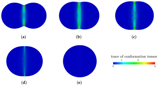 From Figure 12, it can be seen that elevated polymeric strains are present throughout the contact area between the two particles. This might lead to crystalline structures in large parts of the system and influences the material characteristics of sintered products. The trace of the conformation tensor at point at the surface of the neck in time t for different Deborah numbers , using the Giesekus model with , is shown in Figure 13. The polymeric strain increases with increasing Deborah number and is negligibly small for .