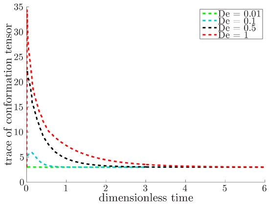 The trace of the conformation tensor at point at the surface of the neck in time t for different Deborah numbers , using the Giesekus model with .