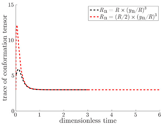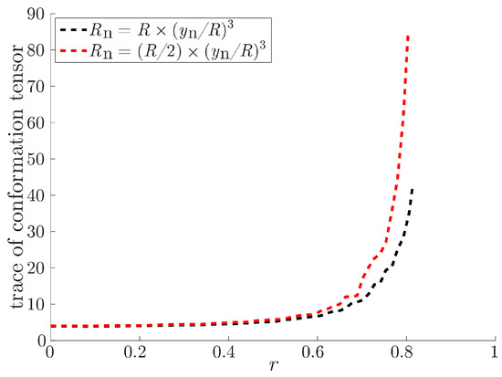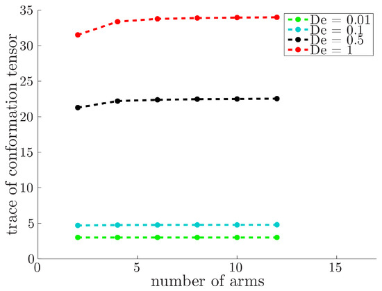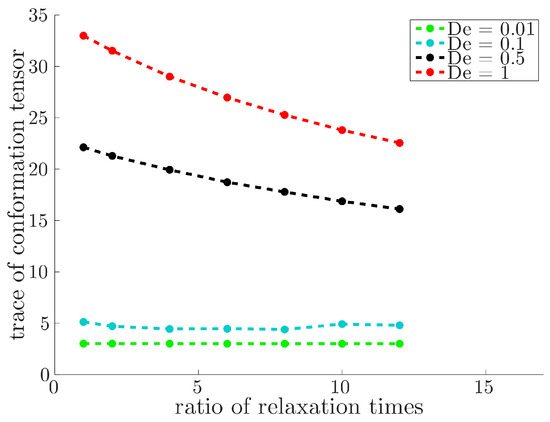 In the XPP constitutive model, both the ratio between the relaxation time of the backbone orientation and that of the stretch and the number of arms q are dimensionless parameters defining the rheological behavior of the system, apart from the Deborah number De. In Figure 18 and Figure 19, the maximum values of the trace of the conformation tensor for different Deborah numbers are shown for , with , and , with , respectively. Both the relaxation time ratio and the number of arms q influence only the results with the highest Deborah numbers . With increasing ratio , the relaxation time of the stretch decreases with respect to the relaxation time of the backbone orientation . Therefore, the polymers are harder to stretch, and the maximum value of the trace of the conformation tensor decreases. Increasing the number of arms q leads to an increase in the relaxation time of the stretch . Since the polymer chains are easier to stretch, the maximum value of the trace of the conformation tensor increases with increasing number of arms q. This effect is visible only for the number of arms .