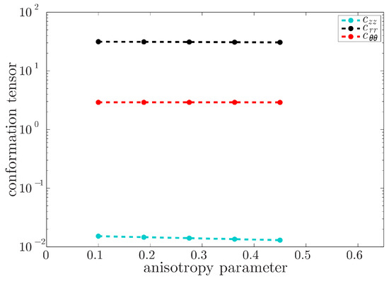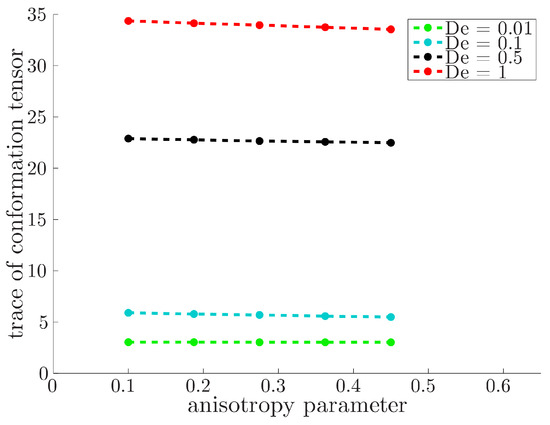 In the Giesekus constitutive model, the anisotropy parameter is, besides the Deborah number De, another dimensionless parameter that determines the flow behavior of the system. The maximum values of the trace of the conformation tensor for different Deborah numbers and anisotropy parameter are shown in Figure 16. The maximum values of the trace of the conformation tensor occur during the start-up of the flow, which is primarily driven by elastic effects. The elastic stresses are determined by the modulus G and the strain. The anisotropy parameter determines the non-linear relaxation, and therefore, has only a small influence on the stresses during the start-up of the flow.